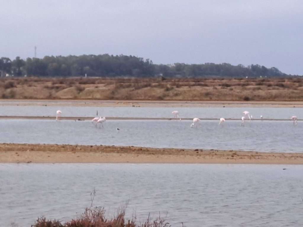 Es sind auch wieder Flamingos zu sehen, die im flachen Brackwasser nach Futter schnäbeln.