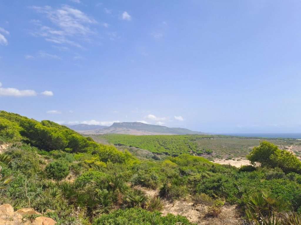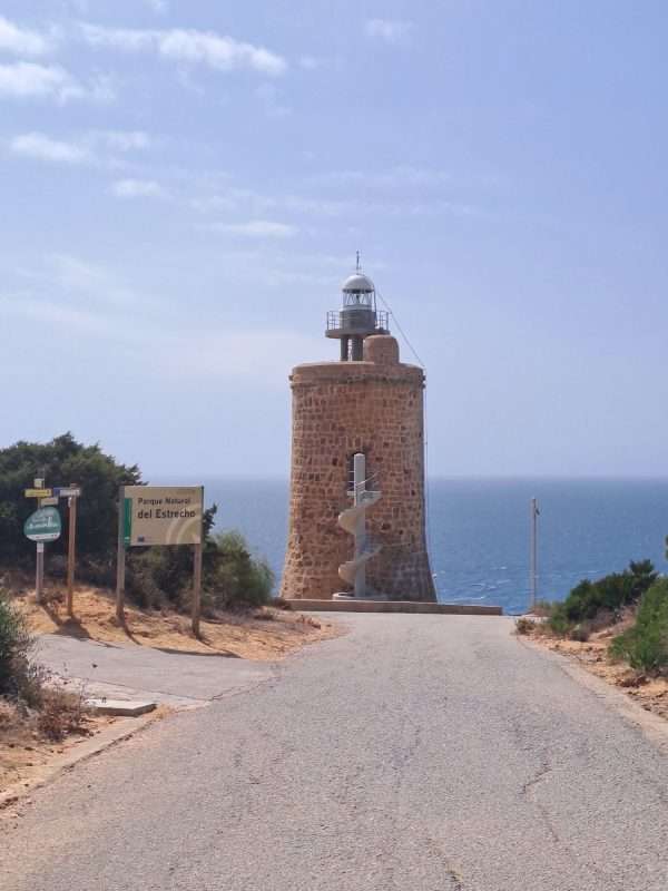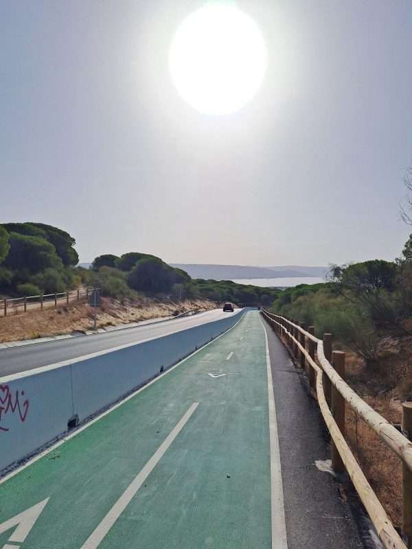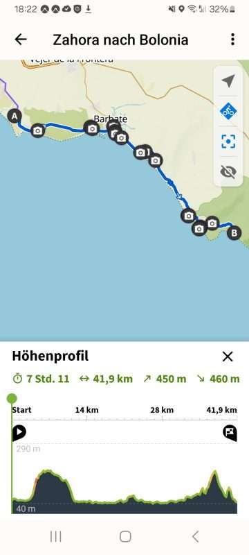 Der nächste Berg wartet schon. Vor Bolonia erklimmen wir die steile Höhe, müssen aber leider feststellen, dass wir hier oben nicht weiter kommen. Sackgasse. Also wieder ein Stück runter und bei 28 Grad die Straße zum Leuchtturm hoch. Hier soll es einen breiten Schotterweg geben.