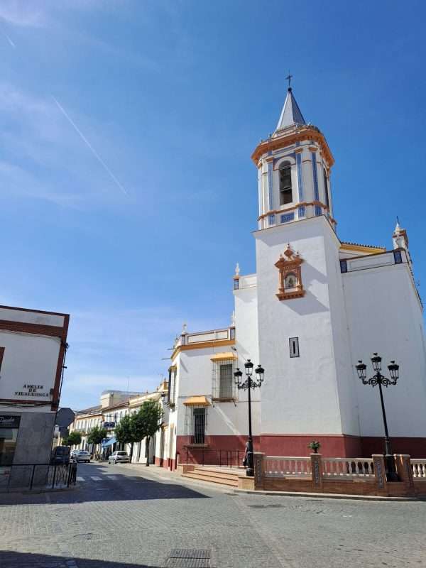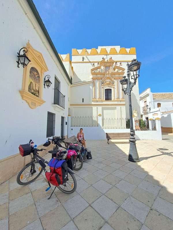 Die Mittagspause verbringen wir bei 35 Grad im Schatten vor der Kirche in Benacazión.
