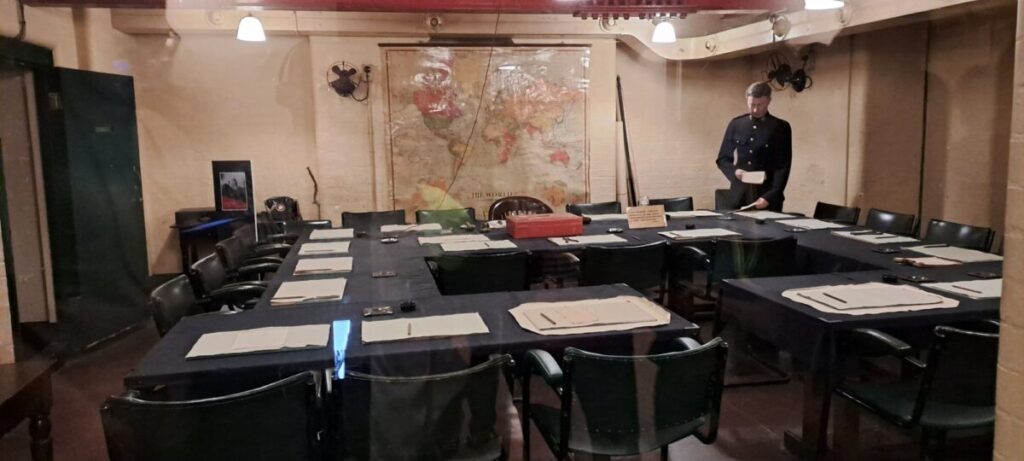 Während des Krieges arbeiteten bis zu 500 Leute in Churchill’s geheimer Kommandozentrale. Diese War Rooms waren unter einem Gebäude vor Bombeneinschlägen geschützt. Von hier aus wurde der Kampf gegen Hitler-Deutschland geführt.