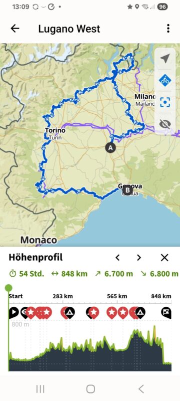 Dort beginnen wir die eigentliche Tour (blaue Linie). Wir verlassen schnell die teure Schweiz in Richtung Italien. Es geht zunächst durch die Lombardei, vorbei am Luganer See und dem Lago Maggiore.