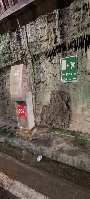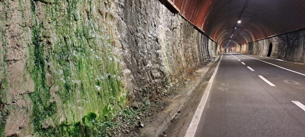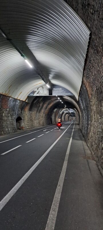 Der letzte Tunnel der Trasse ist 1750 m lang. An der Decke hängen in ca. 100 m Abständen Infotafeln mit Fakten zum Radsport, hauptsächlich zum Giro Italia. Angenehm kühl ist es hier im Berg.