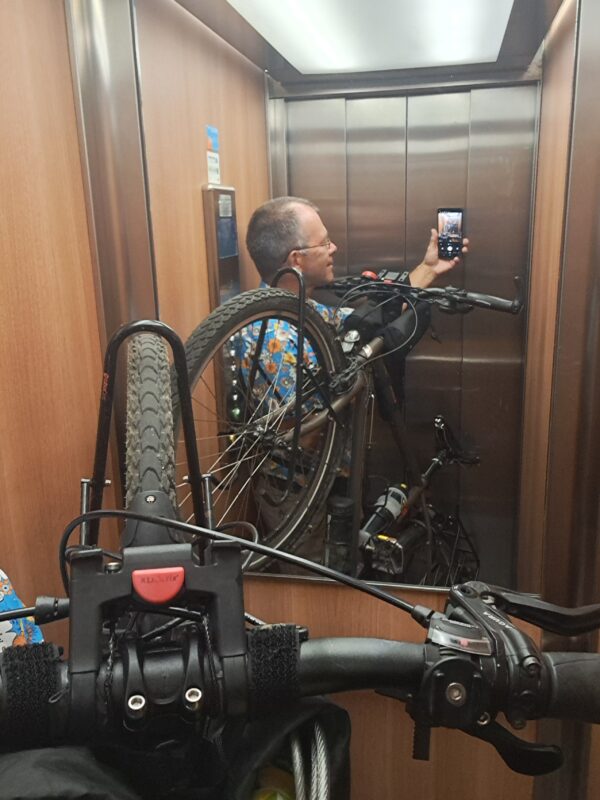 Die Fahrräder in einem kleinen Aufzug in den 7. Stock zu unserem Apartment zu bugsieren, ist natürlich etwas umständlich.