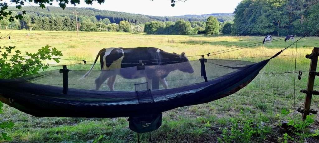 Die Nacht ist zwar zwar mit ca. 12 Grad nicht außergewöhnlich kalt, aber in der Hängematte ist es luftig und mein Aldi-Schlafsack wärmt nicht sonderlich. So zittere ich mich ein wenig in den Schlaf und schlage morgens um 8 mein Lager ab.