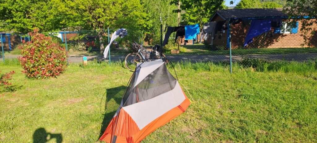 Mein Zeltplatz für heute liegt in Celles-sur-Plaine. Direkt im Ortszentrum, sehr sauber und gepflegt für nur 11,94€. Krumme Zahl.