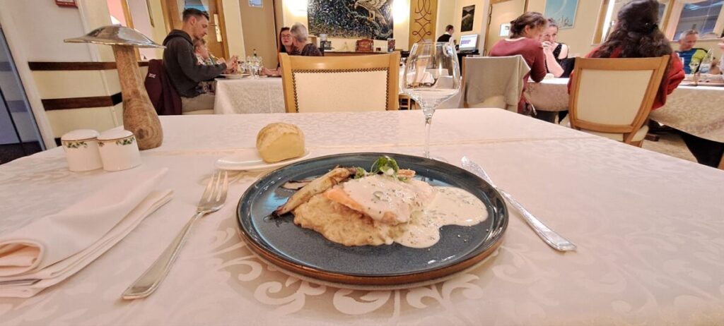 Sehr vorzüglich der Lachs auf Risotto und der Schokotraum. Alleine der Gruß aus der Küche, eine Winzigkeit Spargelcreme, ist eine Offenbarung.  Hier bürstet der Service sogar die Tischdecke zwischen den Gängen ab.