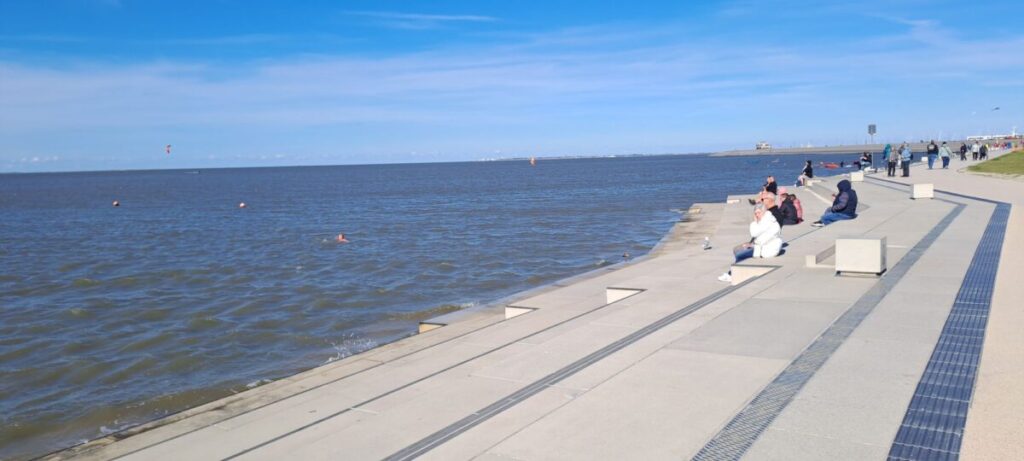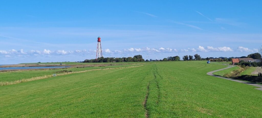 Norddeich Mole: Ab hier beginnt mein 50 km langee, zermürbender Kampf mit einem heftigen frontalen Gegenwind bis Bensersiel. Ich liebe E-Biker, denn die spenden einen wunderbaren Windschatten. Nur sollte man vorsichtig sein, denn die meisten der Herrschaften werden sehr nervös, wenn man nur eine Handbreit hinter ihnen fährt. Schnell wird mal unvermittelt gebremst, geschlenkert oder abgebogen.