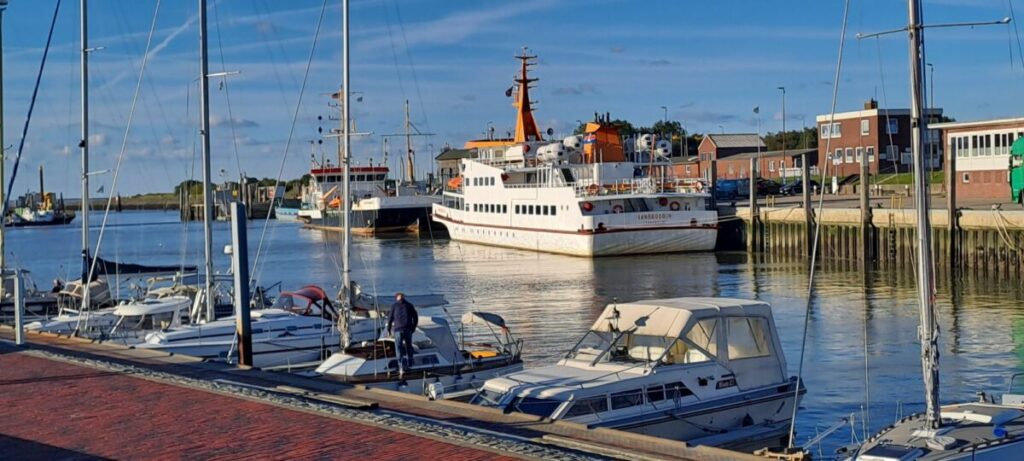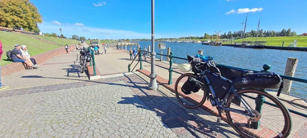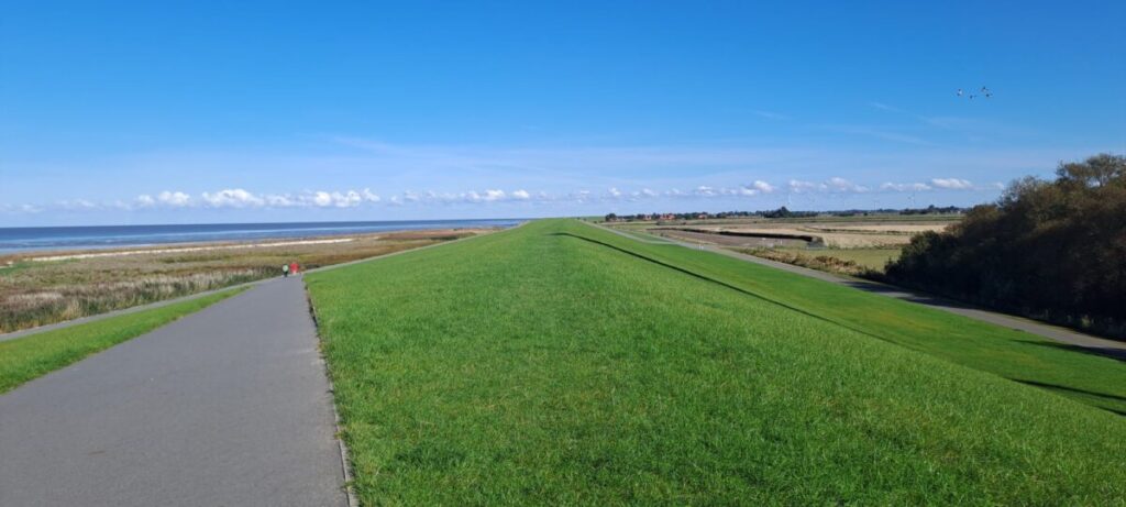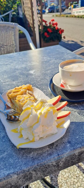 In Dornumersiel führt eine lebensfrohe georgische Unternehmerin das italienisch anmutende Eiscafe „Ponte Vecchio“. Apfelkuchen und Cappuccino bringen mich wieder in Schwung für die letzten Kilometer.