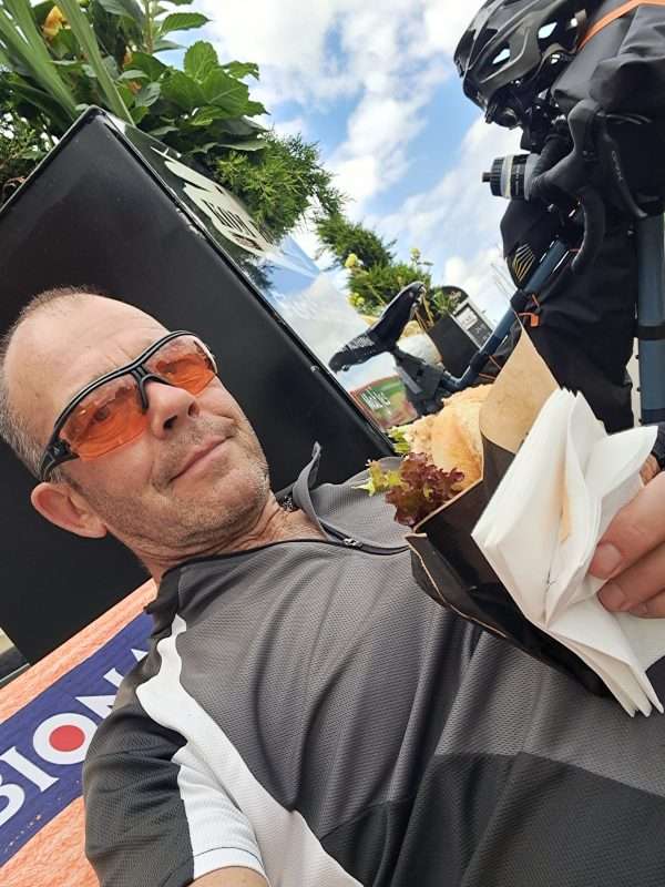 Nur 8 km vor dem Ziel ist der Vorderreifen platt.