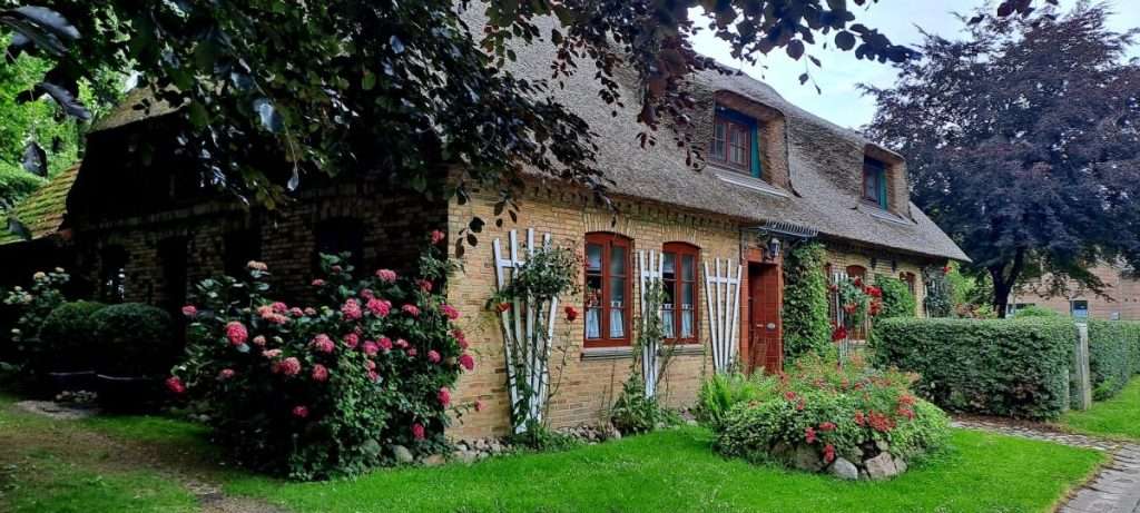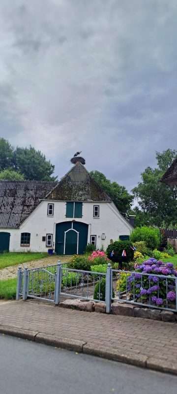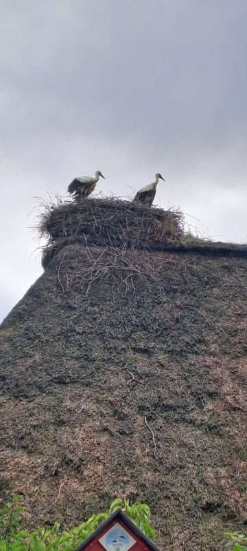 Bergenhusen wirbt für sich als das Storchendorf. Tatsächlich sieht man einige der schönen Vögel auf den Dächern sitzen.