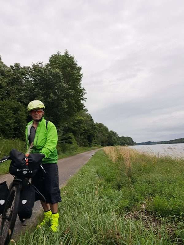 Doch um 11 Uhr setzt Niesel-, dann kräftiger Landregen ein. Ein Mitradler aus San Francisco, der vor 10 Wochen von Athen aufbrach und nach Oslo möchte, ist zuversichtlich, dass es nur eine kleine Schauer sei.