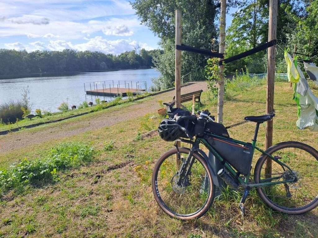 Hier ist nichts los. Der See gehört fast mir alleine. Die Rezeption ist unbesetzt. Ich kann mir auf diesen riesigen Areal aussuchen wo ich campieren möchte. Der Platz hat den morbiden Charme eines „Lost Place‘. Überall erkennt man noch die Hinterlassenschaften einstiger Dauercamper-Residenzen: Fliesen, Beton, Keramik.