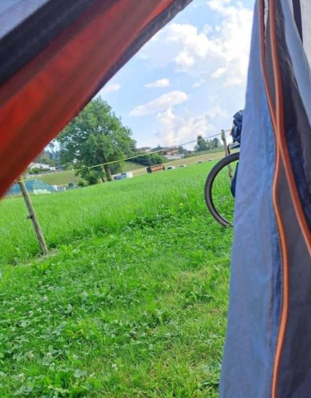 Mein portugiesischer Nachbat Miguel unterhielt sich noch recht lautstark mit seiner Partnerin bis mindestens halb 3 in der Nacht. Zwischendurch erklang die Ukulele und lila Wolken waberten über die Kuhwiese. Dazu sang sie mit einer bezaubernden Stimme, das muss ich sagen. Am Morgen unterhalten wir uns nett und er gibt mir seine Nummer. Es sei kein Problem ihn in seinem Heimatort Nazare‘ zu kontaktieren. Ich freue mich, Miguel.