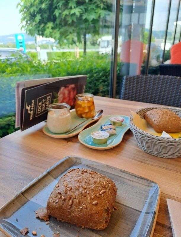 Nach einem „Sportlerfrühstück“ im Restaurant des Rhein-Camping mit 2 Brötchen, Marmelade, Müsli, Honig, Obstsalat und Cappuccino kann der Tag beginnen.