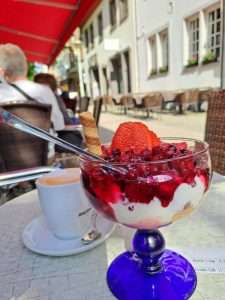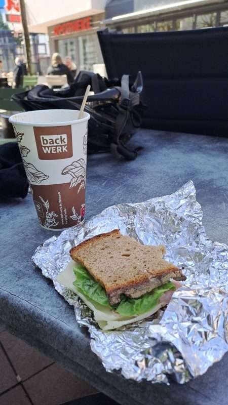 Nach rund drei Stunden und 50 km gibt’s in der Fußgängerzone von Euskirchen ein kleines Frühstück m it Susanne´s leckerem Brot.